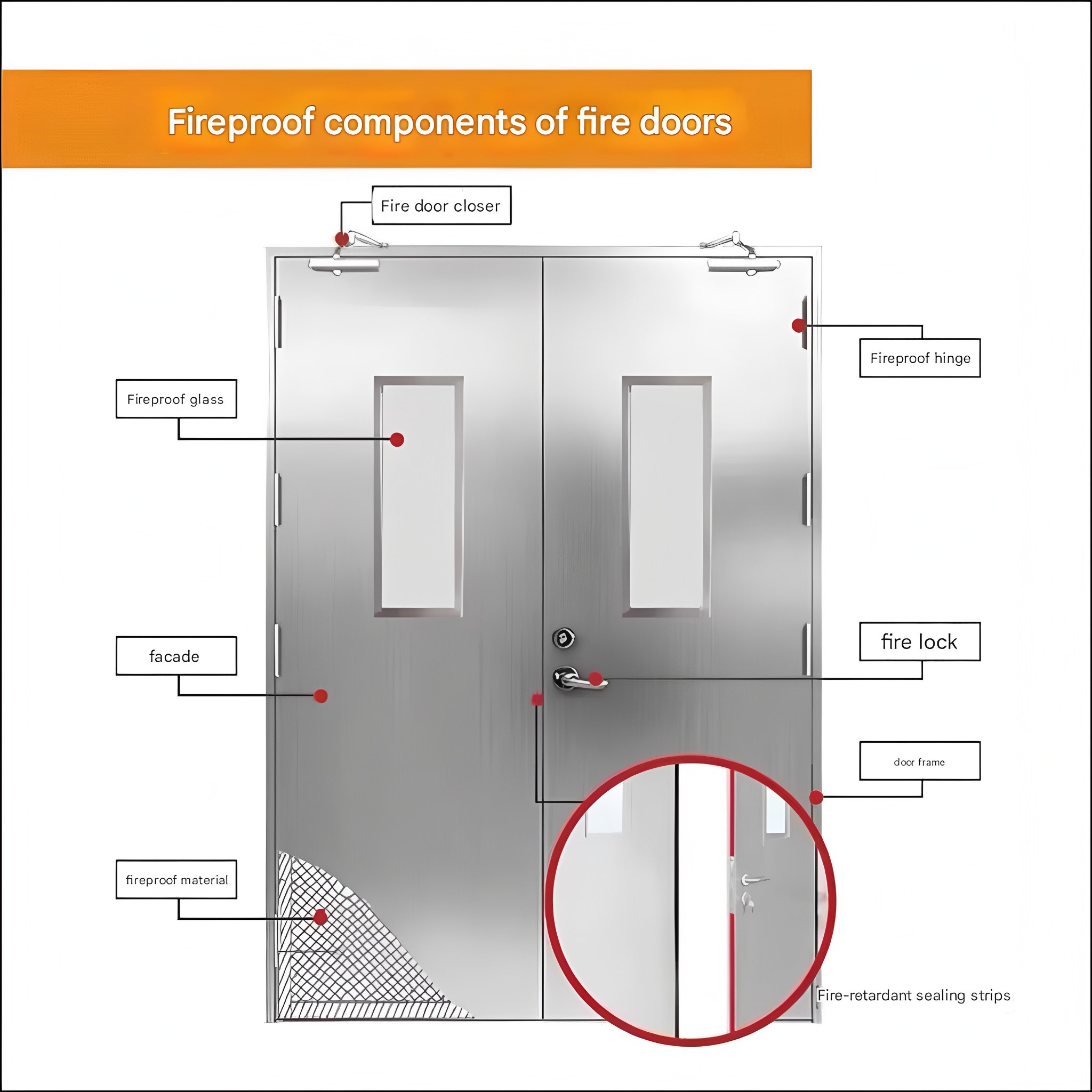 A: Only fire-certified dedicated parts (such as fire-rated locks, hinges, and door closers) must be used. Ordinary parts cannot withstand high temperatures and may fail rapidly in a fire, compromising the door's protective function.