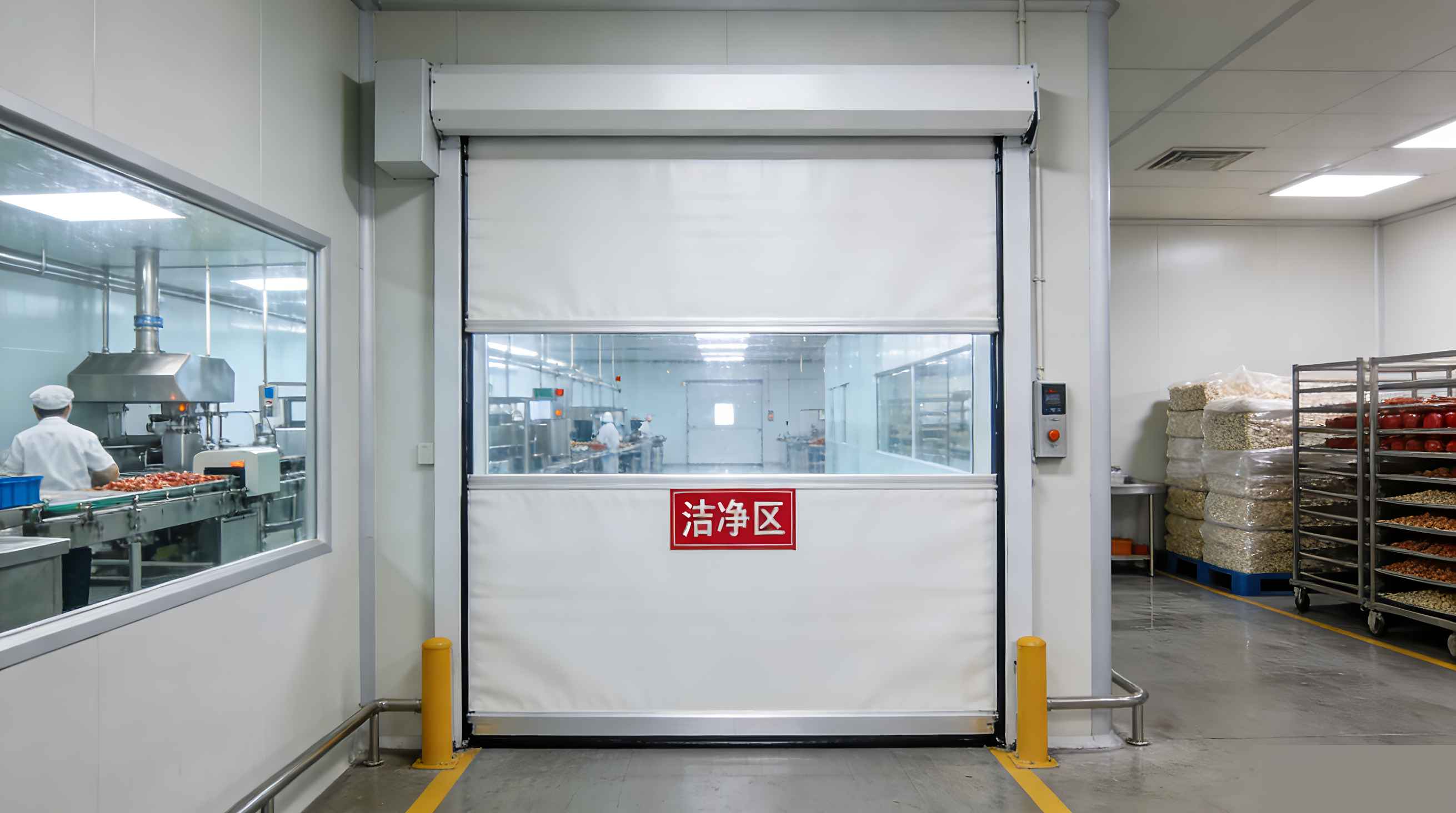 1. In food processing plants, PVC high-speed doors remain closed to isolate clean areas from non-clean areas, enabling rapid separation of different zones. They are dust-proof and insect-proof, easy to clean, directly support food safety standards, and reduce the risk of contamination.
