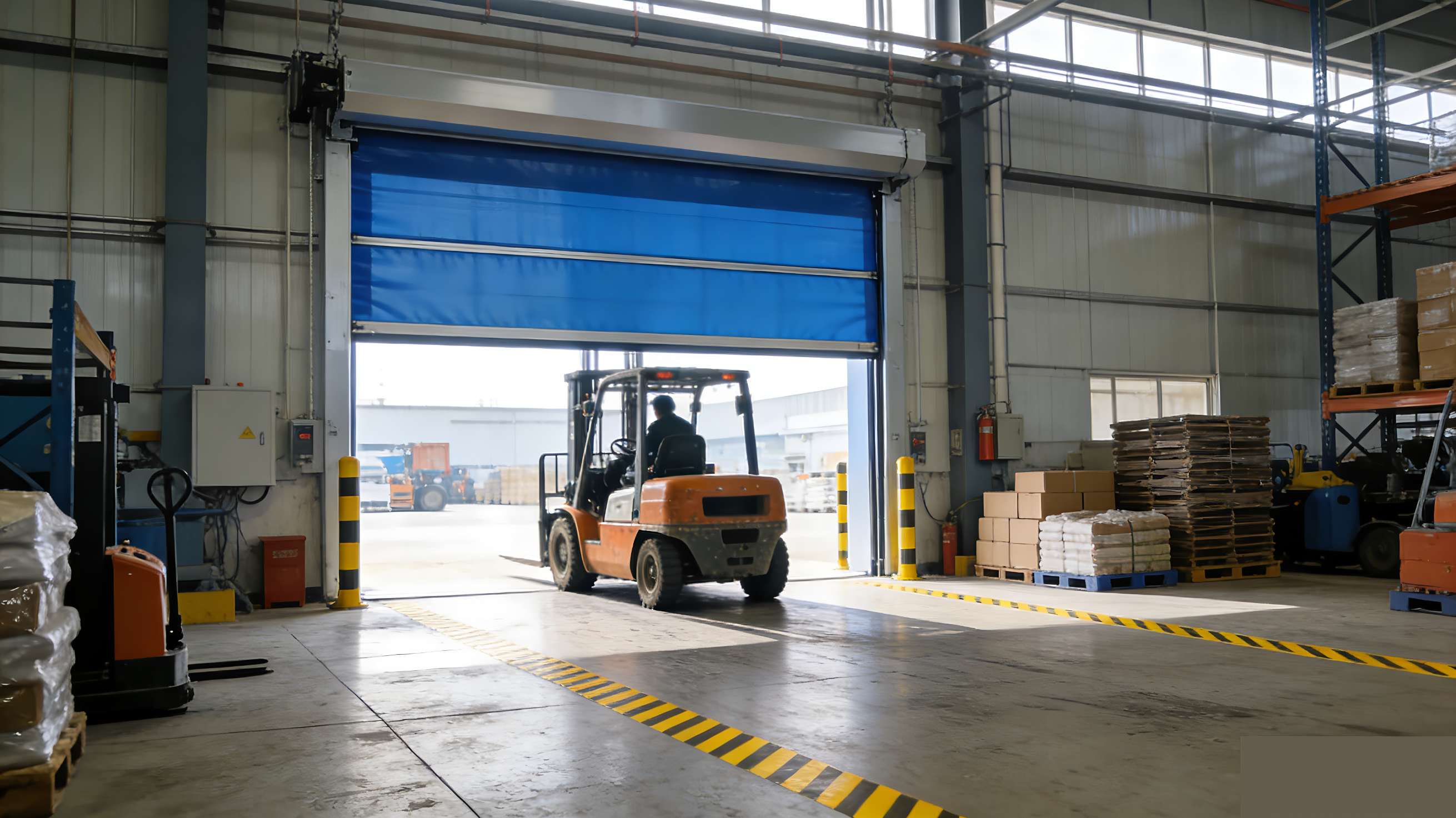 2. In industrial plants, PVC high-speed doors open rapidly, allowing forklifts to pass through while transporting goods. This enables quick passage, reduces logistics waiting times, optimizes production rhythm, and maintains a low failure rate under high-frequency use, leading to long-term savings in maintenance costs.